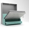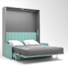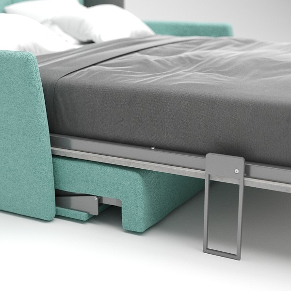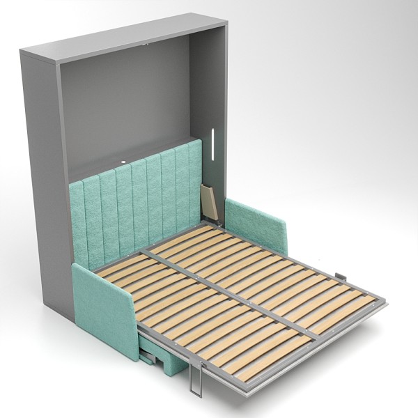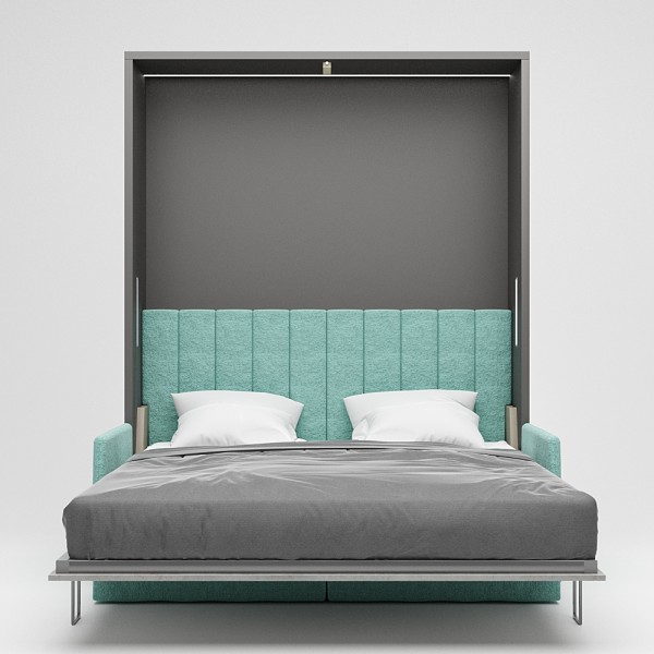 Nappal az ágy egy diszkrét, keskeny szekrényben rejtőzködik, mely alig foglal helyet a térben, de este, az ajtólap gyengéd megnyomásával az ágy lassan, automatikusan lenyitható. A kanapé ülőfelülete, köszönhetően egy speciális vasalatnak, szinkronizáltan mozog az ajtólappal, így nyitáskor az ágy alá süllyed. A kanapé háttámlái pedig az ajtólapra szereltek, így azzal együtt mozognak. Köszönhetően a prémium minőségű olasz vasalatnak, nem kell lemondanunk a hagyományos ágyak kényelméről és stabilitásáról. Az igényeinknek megfelelő fekvőfelületet masszív fém ágykeret és lábak, valamint rugalmas fa ágyrács támasztja meg. Az ágy lenyitása bármelyik pozícióban könnyen megállítható, köszönhetően a nagy teljesítményű teleszkópokkal kiegyensúlyozott mechanizmusnak. A működtető vasalatot esztétikus burkolat takarja és védi, megakadályozva az esetleges becsípődést. A burkolat felső részében telefontartó is kialakításra került. Az ágyrácsot megtámasztó fém lábak szinkronvezéreltek, azaz minden pozícióban függőlegesen állnak, nem kell külön figyelni a beállításukra, kinyitásukra.